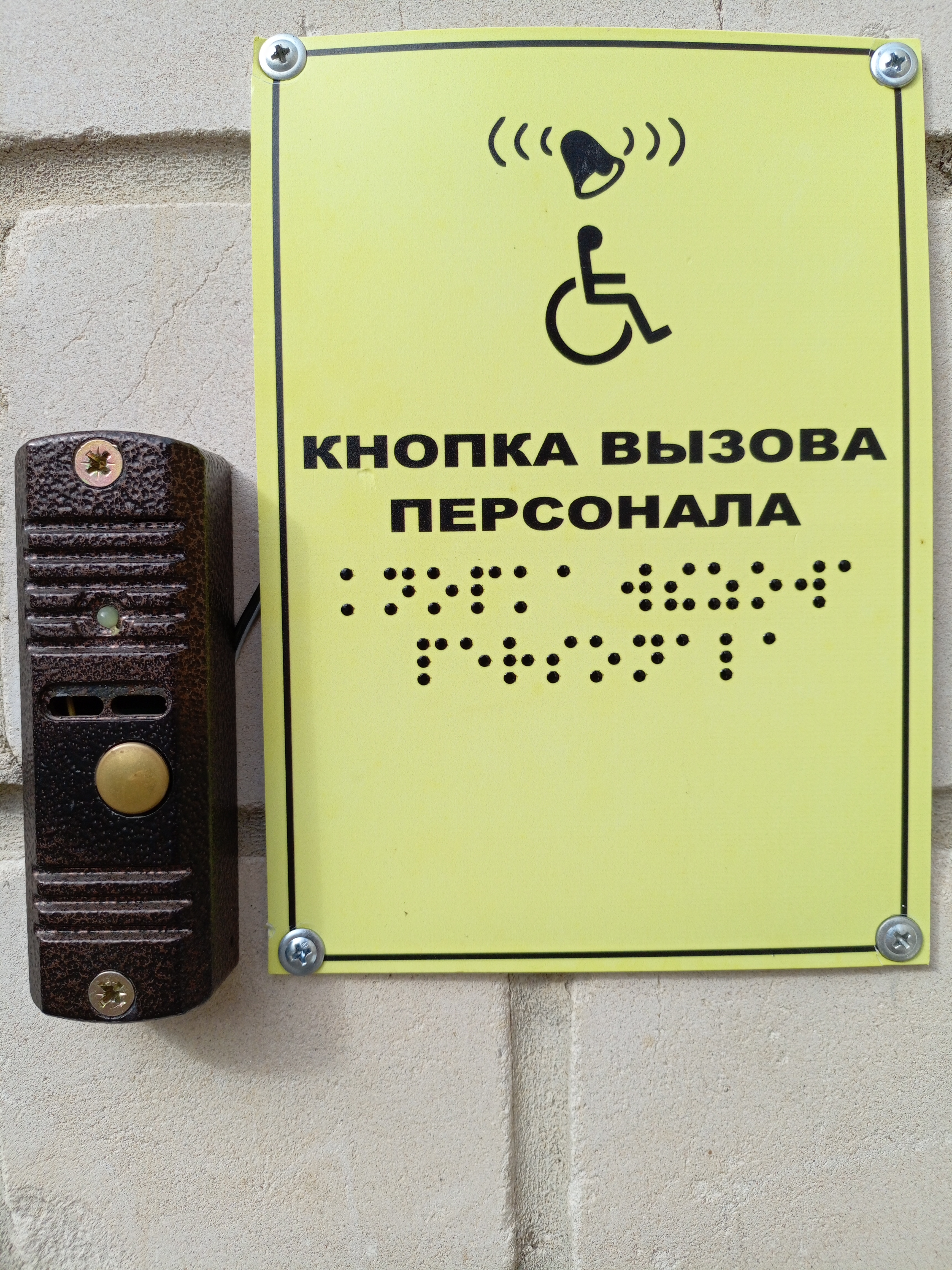 Учреждение оборудовано информационным табло с названием учреждения и шрифтом Брайля, кнопкой вызова персонала, продублированной знаком доступности.