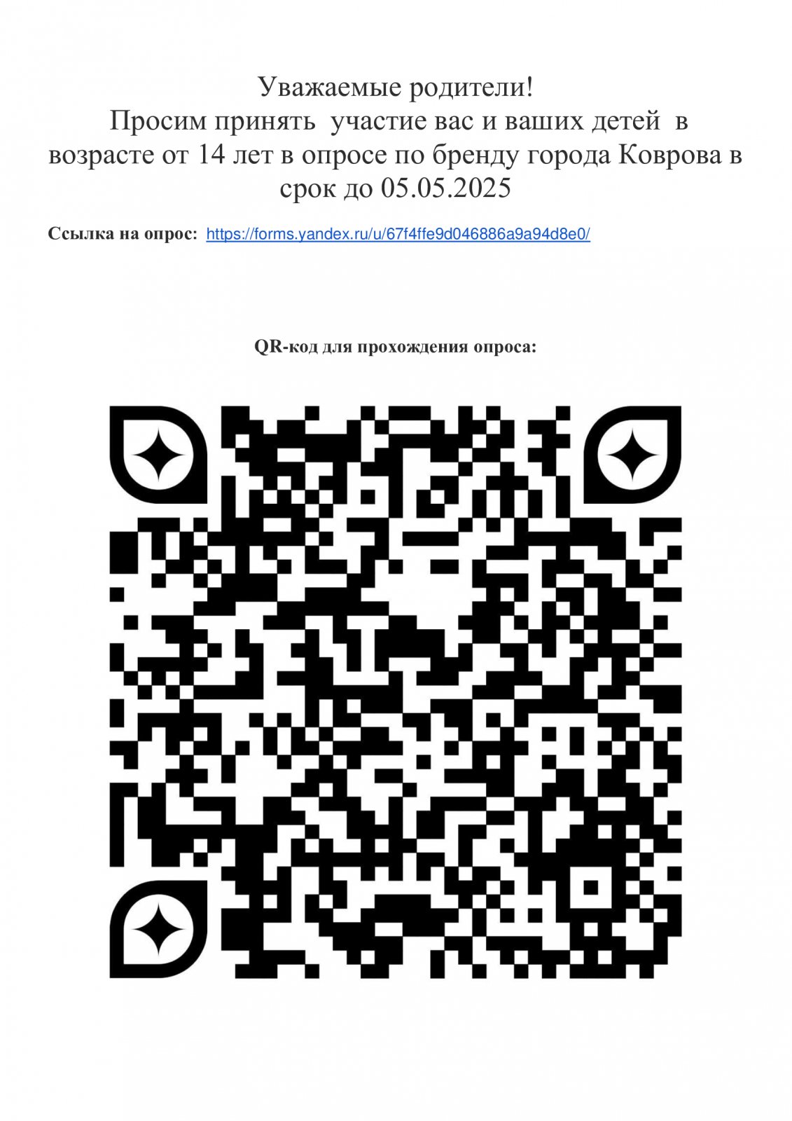 Просим принять участие вас и ваших детей в возрасте от 14 лет в опросе по бренду города Коврова в срок до 05.05.2025