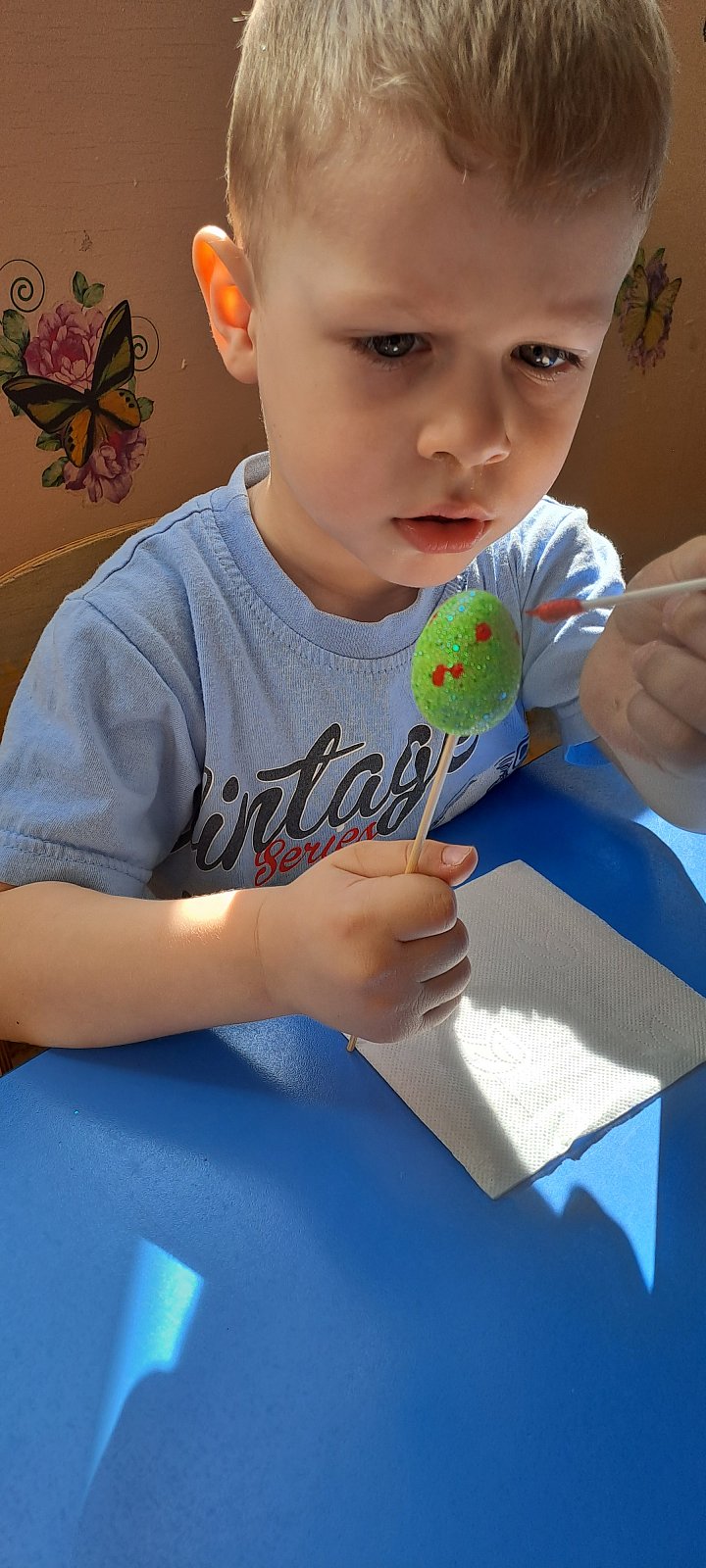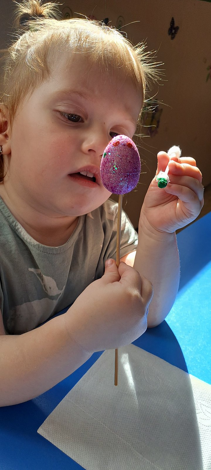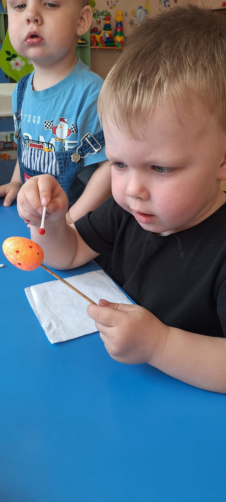 Детям были предложены на выбор яйца - муляжи. С помощью красок, дети красили яйца, по своему желанию используя технику «тычок».