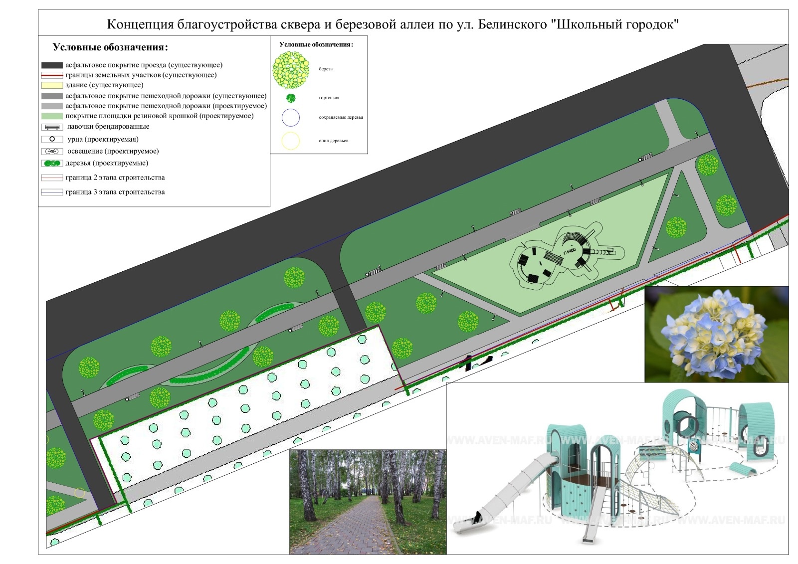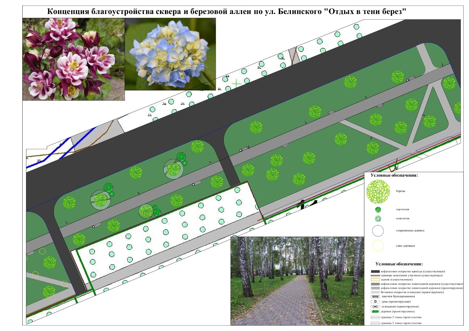 Планируется устройство освещения, клумб, лавочек и урн, а также высадка гортензий на клумбах и новых саженцев берез. В целом данный дизайн-проект предусматривает минимальное вмешательство в существующее озеленение и планировку территории.