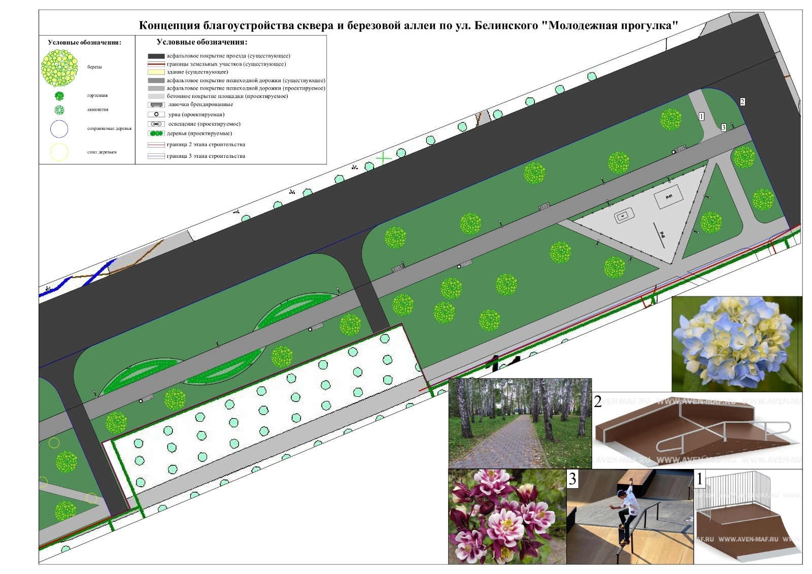 Проект включает в себя устройство освещения, клумб, лавочек и урн, высадку новых саженцев берез, а также гортензий и аквилегий на клумбах. Важным наполнением является размещение бетонной площадки с ограждением-сеткой и установкой элементов скейтбординга (рампа и т.д.)