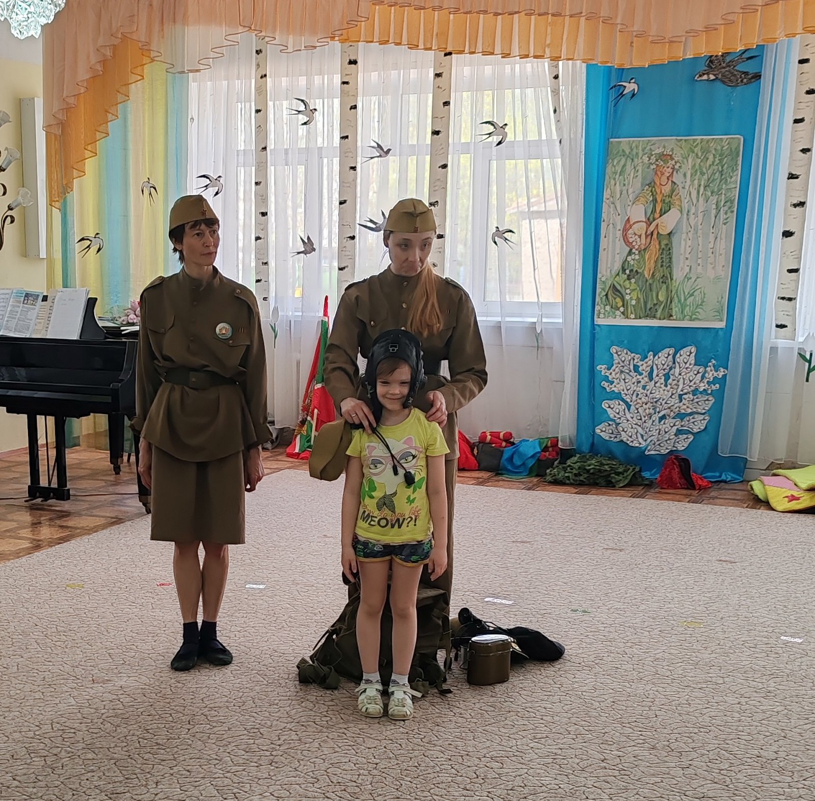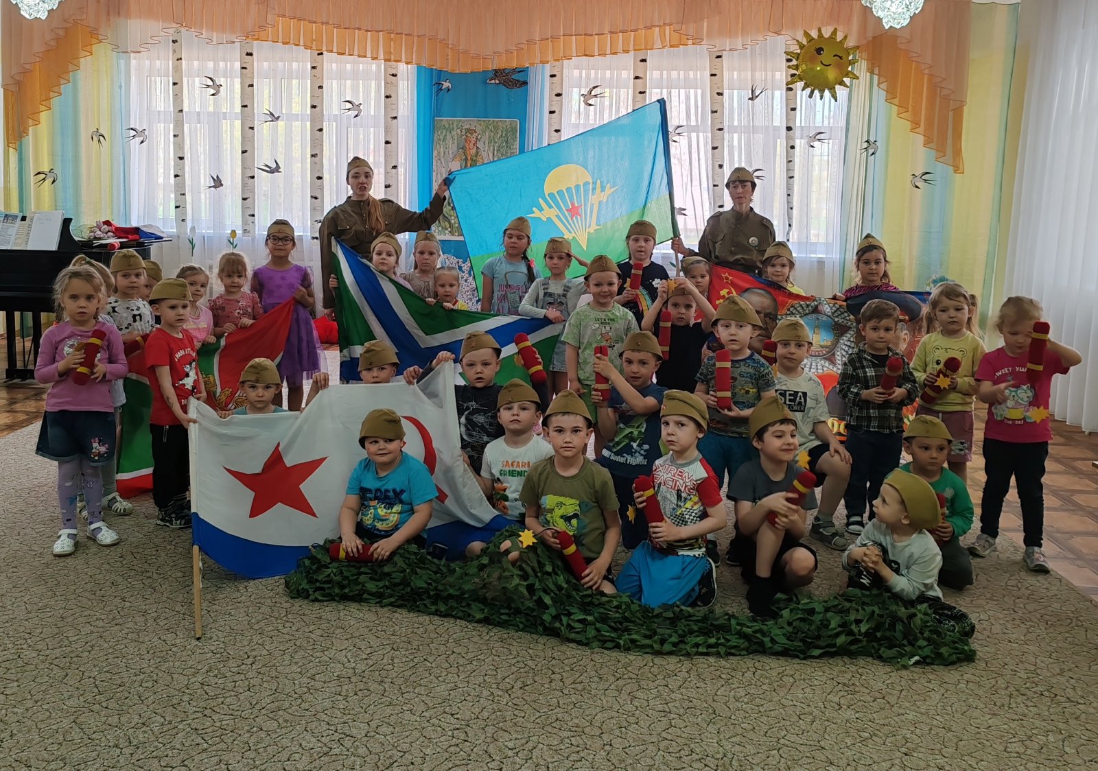 Дети участвовали в играх и с большим удовольствием выполняли интересные задания. Познакомились с флагами родов войск, прошли торжественным маршем с ними. Познакомились с предметами необходимыми для военных: военный вещмешок, котелок, фляжка, алюминиевая кружка, бинокль, фуражка командира, шлем танкиста и летчика.