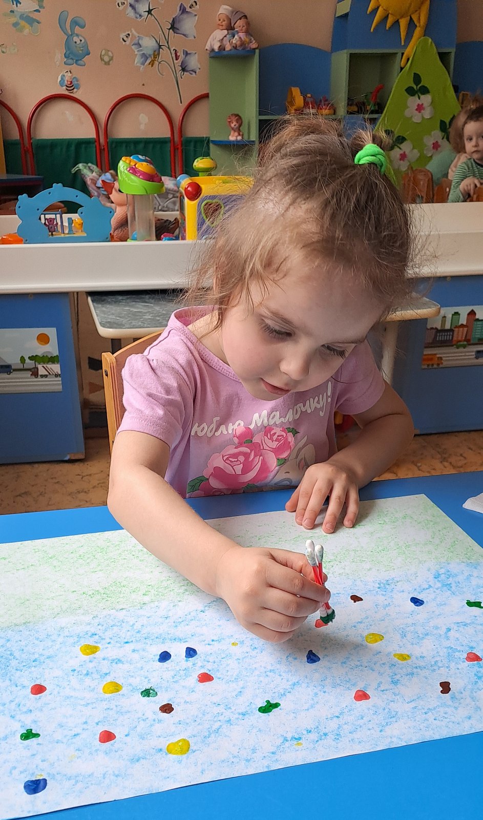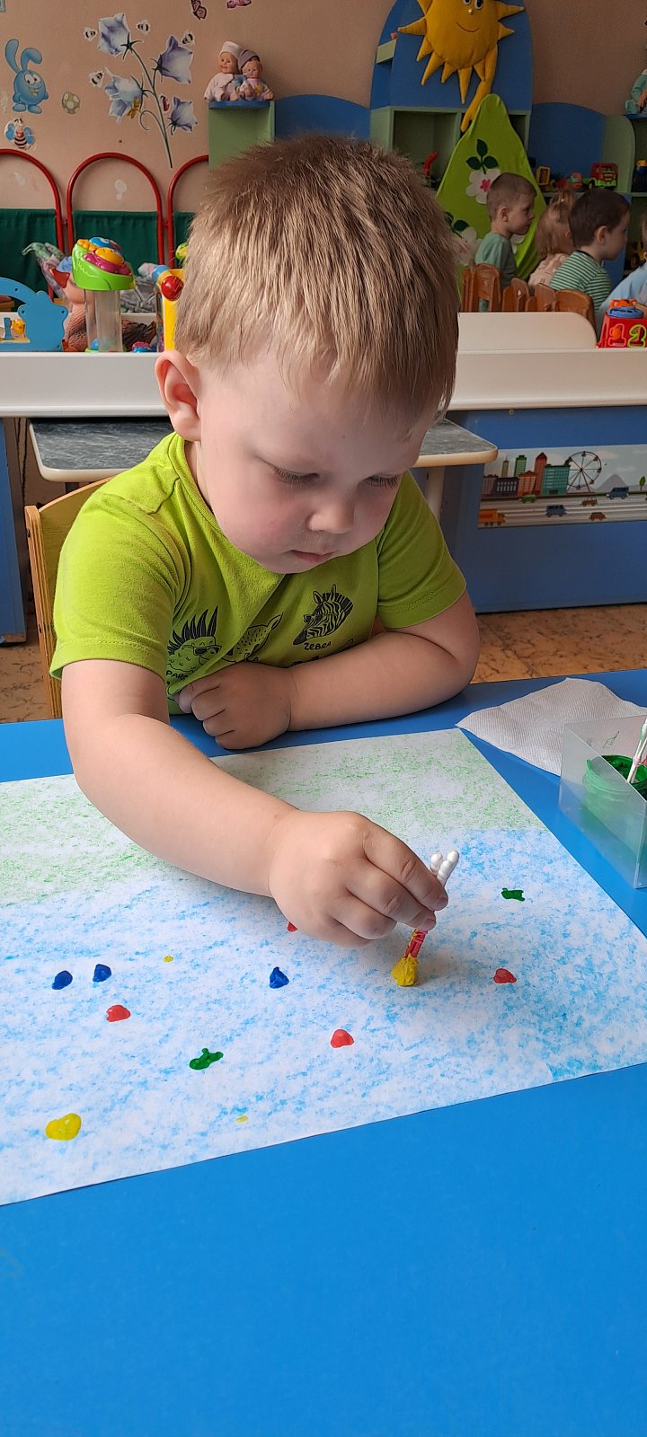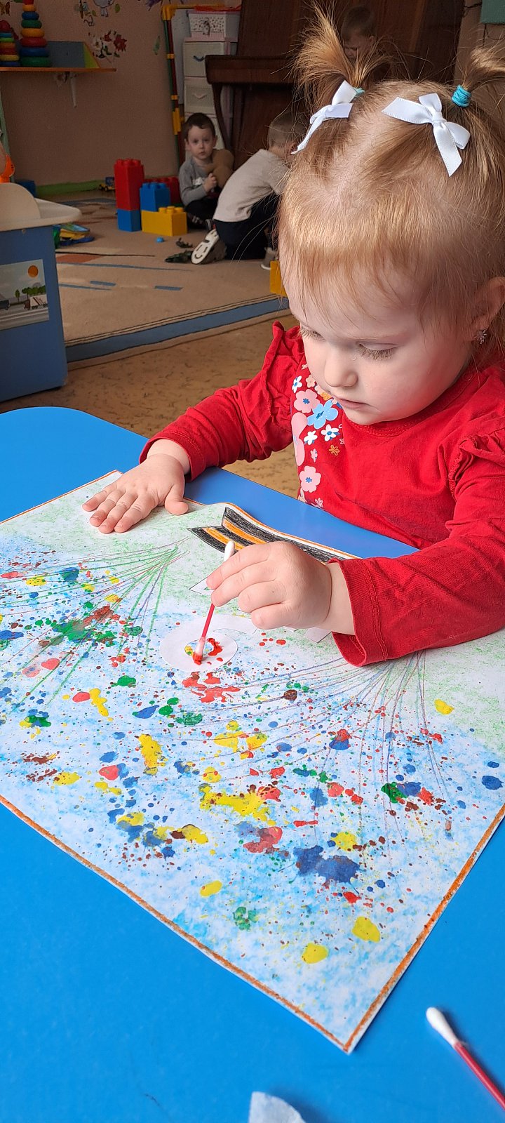 Вместе с воспитателем дети учились изображать праздничный салют, используя нетрадиционную технику рисования методом «тычка».