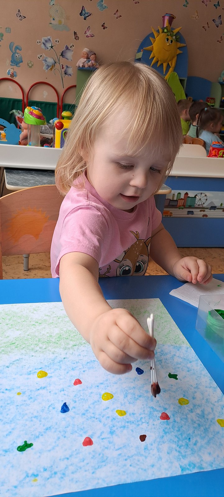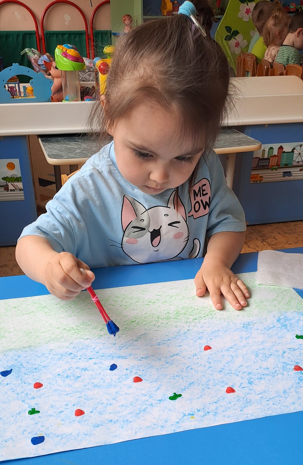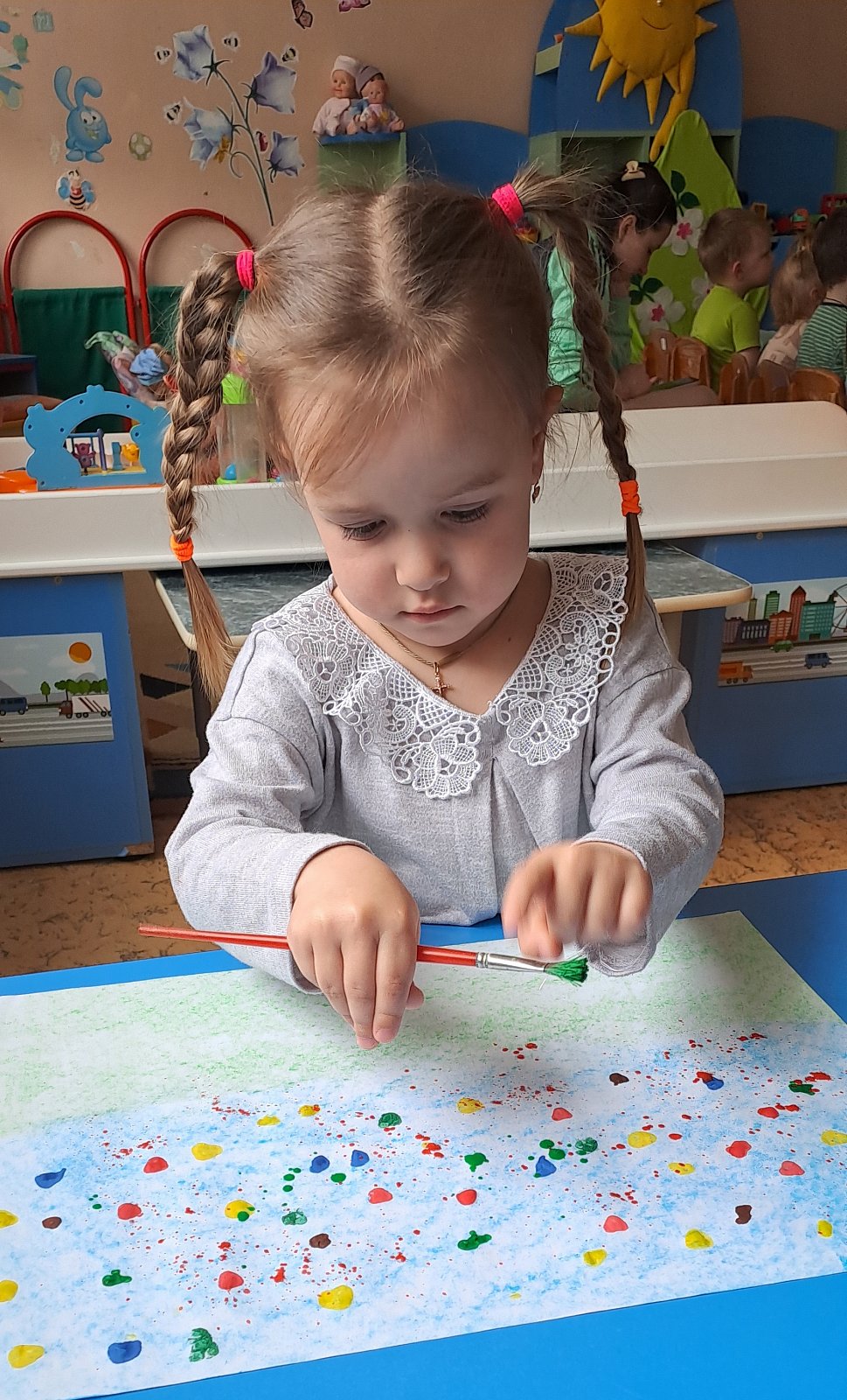Вместе с воспитателем дети учились изображать праздничный салют, используя нетрадиционную технику рисования методом «тычка».