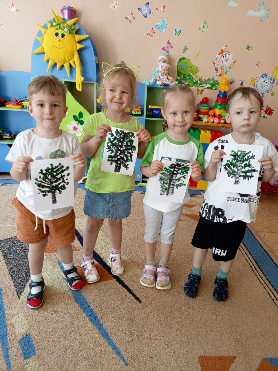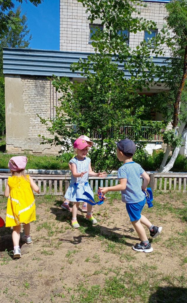Не отставали и воспитанники младшего дошкольного возраста. Они любовались березкой на участке, потрогали её листочки, кору. Играли в подвижные игры «Кто быстрее до берёзки», «Дождик».