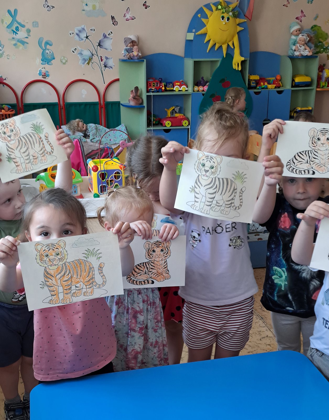 Ребята разучили пальчиковую гимнастику «Раз, два, три, четыре, пять, вышел тигр погулять», были предложены раскраски с изображением тигра. На прогулке с детьми поиграли в подвижную игру: «Что умеет делать тигр».