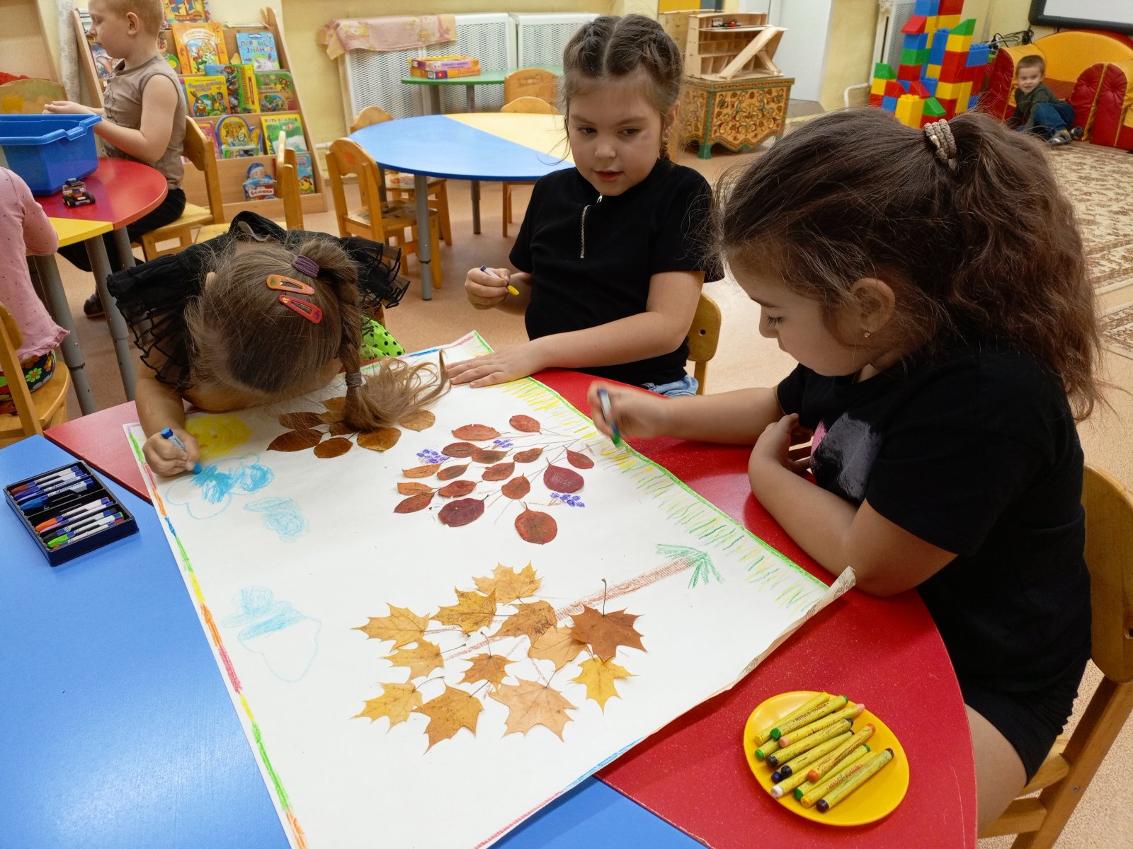 Ребята старшей группы, решили сохранить красоту, прекрасного времени года в своей работе - аппликации с элементами рисования: "Осенние деревья".