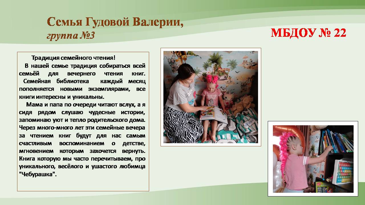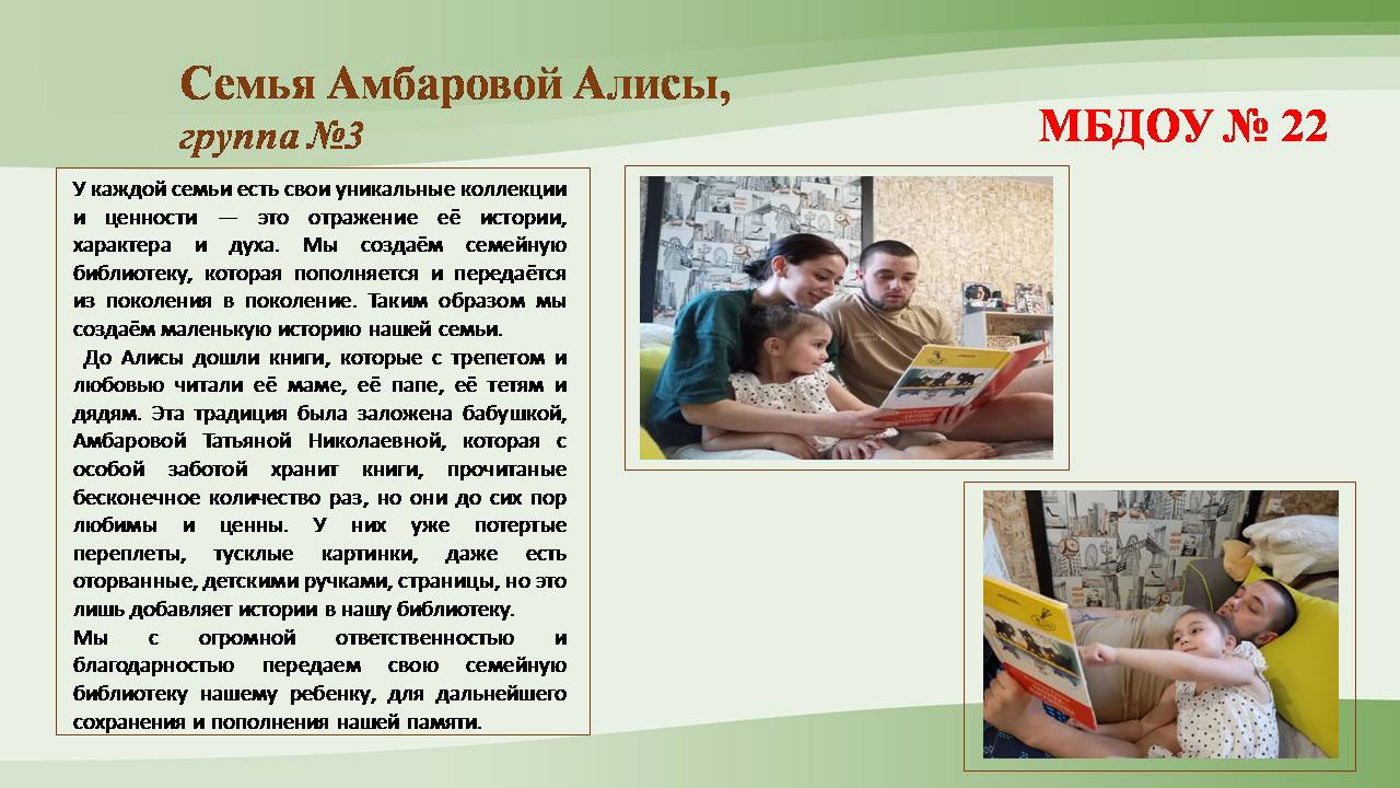 Данная эстафета была посвящена традициям семейного чтения. Это мероприятие собрало вместе семьи воспитанников из различных детских садов нашего города. Каждый ребенок рассказал, как они со своими родителями читают любимые книги дома всей семьей. Ведь ни для кого ни секрет, что любовь к книге прививают, прежде всего, родители, бабушки и дедушки. Вместе они погружаются в сказки, стихи, рассказы, истории, создавая незабываемые воспоминания. Каждая читающая семья хранит особенную книгу, которая становится любимицей.